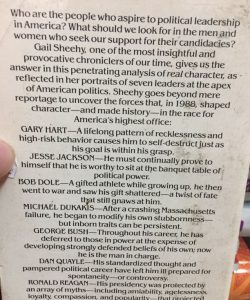 The author of the best-selling Passages has turned her attention again to what makes high achievers tick. In this study, she undertakes extensive interviews with the principals, and those close to them, who began the marathon of American politics in hopes that the road would end in the White House. The book assumes that an informed electorate should know more about those who would be president than is conveyed by a slick PR image. Sheehy concentrates on Hart, Gore, Dukakis, Jackson, Dole, Bush, and President Reagan as case studies. Hart is documented as his own worst enemy; Jackson has his enemies chronicled; Dole is dogged and insensitive; Bush is a plodder who tries to please too many. The crafty Gore is contrasted with the other wunderkind, Dukakis, who became flexible in defeat but retained his principles. Artistic and compelling. Highly recommended. Frank Kessler, Missouri Western State Coll., St. Joseph Copyright 1988 Reed Business Information, Inc.